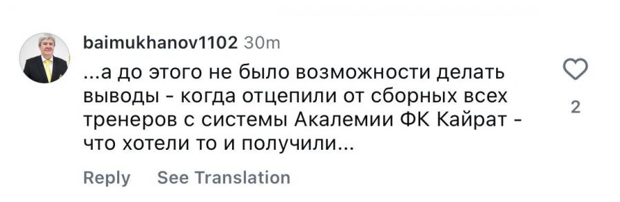 «А до этого не было возможности делать выводы — когда отцепили от сборных всех тренеров из системы Академии ФК «Кайрат». Что хотели — то и получили…» — написал Баймуханов (орфография и пунктуация сохранены).